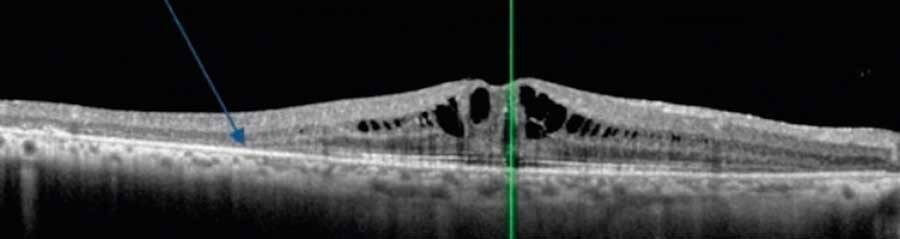 Figure 1. Exemple de patient avec une CRSC et un volumineux DEP séreux rétrofovéolaire responsable d’une baisse d’acuité visuelle à 5/10. Le DEP séreux s’est complètement affaissé 1 mois après un traitement par dexafree collyre 3 fois par jour.